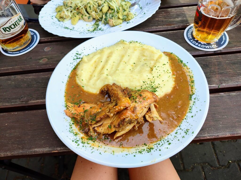 No a pak jsme se vraceli po žluté trase zpět do Třebsína. Jelikož už bylo skoro půl čtvrté a my stále nic neobědvali, zašli jsme na obík do tamní jediné restaurace nazvané Zvonička. 🧑‍🍳 Jak už název stravovacího zařízení vypovídá, stojí u malé vzhledné kaple se zvoničkou. Obsluhoval nás takový správňácký pán – pohodář každým coulem a celé to tam na nás působilo jako jedno velké retro ale v tom dobrém slova smyslu. 😇 Přinesl nám čepované pivo a my si objednali i nějaké to jídlo. Když přede mnou přistál obří talíř s kohoutem na víně a bramborovou kaší za nějakých 220 kaček, byla jsem doslova v sedmém nebi. Jééééžišiiikriiisteee, to byla taková dobrotaaaa! 😋 Z retro restaurace se v mých očích rázem stala doslova gastroperla a za kohouta bych dala nejradši kuchařovi medaili. 🏅 Celou dobu, co jsem to jídlo jedla, jsem si jen říkala, aby to nikdy neskončilo! 😄 Přítel si vybral obyčejné noky se sýrem a mám pocit, že mi mýho kohouta opravdu záviděl. 😂