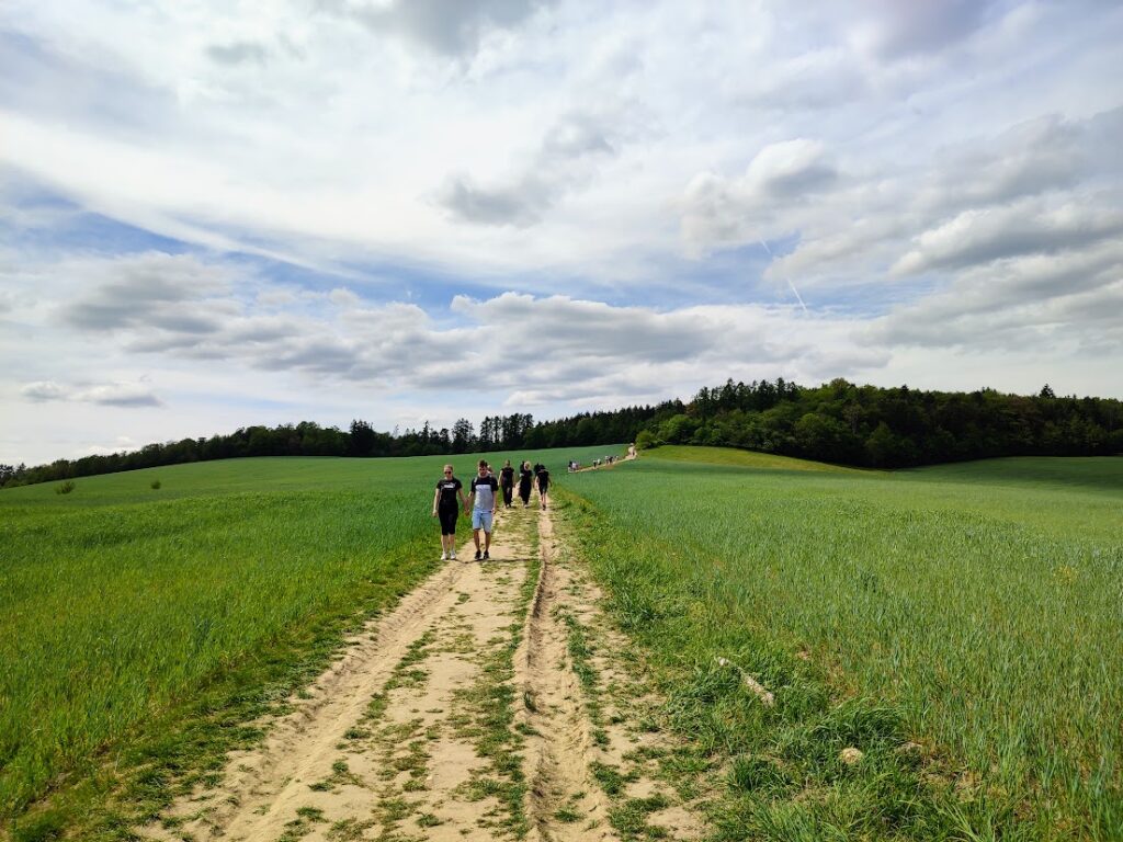 Z Třebsína jsme pokračovali po žluté trase. Slunce úžasně šajnilo a my si chválili, jak nám to počasí parádně vyšlo. Na vyhlídku určitě zajeďte, až bude slunečněji – s modrou oblohou vypadá božštěji. Cesta začala strmě klesat až ke Krňanskému potoku a Smetanově studánce a poté zase nabrala prudký směr nahoru. Z lesa jsme záhy vyšli a užívali si cestu mezi políčky a loukami. Jak já miluju tyhle polňačky a výhledy do zelené české krajiny! 😍 Jen škoda, že tam někdo vysypal několik valníků starých červených střešních tašek, po kterých se nám fakt zle šlo.