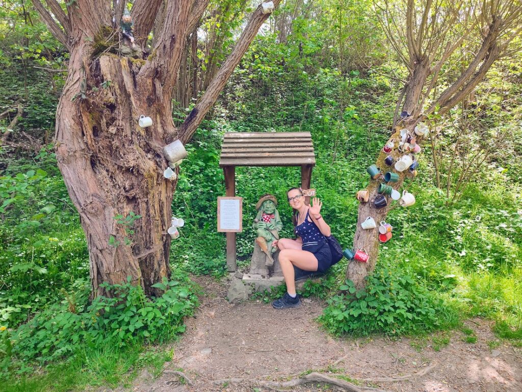 Z červené stezky jsme se odpojili a přešli na zelenou směr Třebsín, což je taková malá a milá vesnička. Ještě než do vsi vstoupíte, tak potkáte zeleného frajírka vodníka Třeba, který tam sedí s puntíkatým hrníčkem v packách a je svolný k vyfocení se s vámi. Nebojte, neutopí vás. On tam ani nemá pořádně kde totiž… 😅