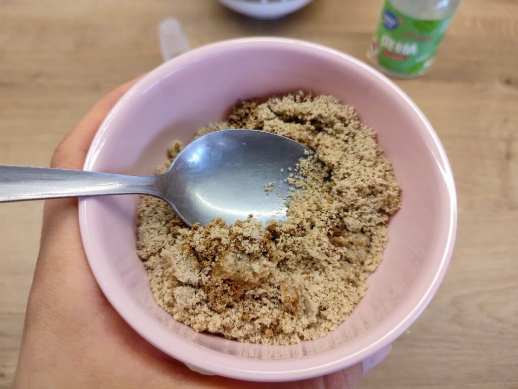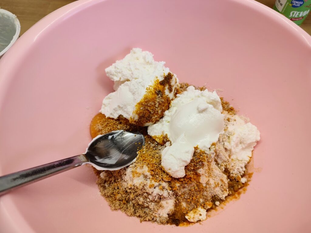 Udělejte si drobenku v malé mističce. Na drobenku použijte mletý bílý mák, 1 – 2 lžičky bílkového sněhu, 2 lžíce tekutého stéviového sladidla, 1 lžičku koriandru. Promíchejte, vytvoří se hrudky.