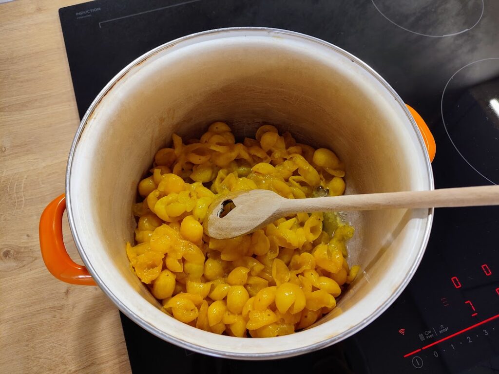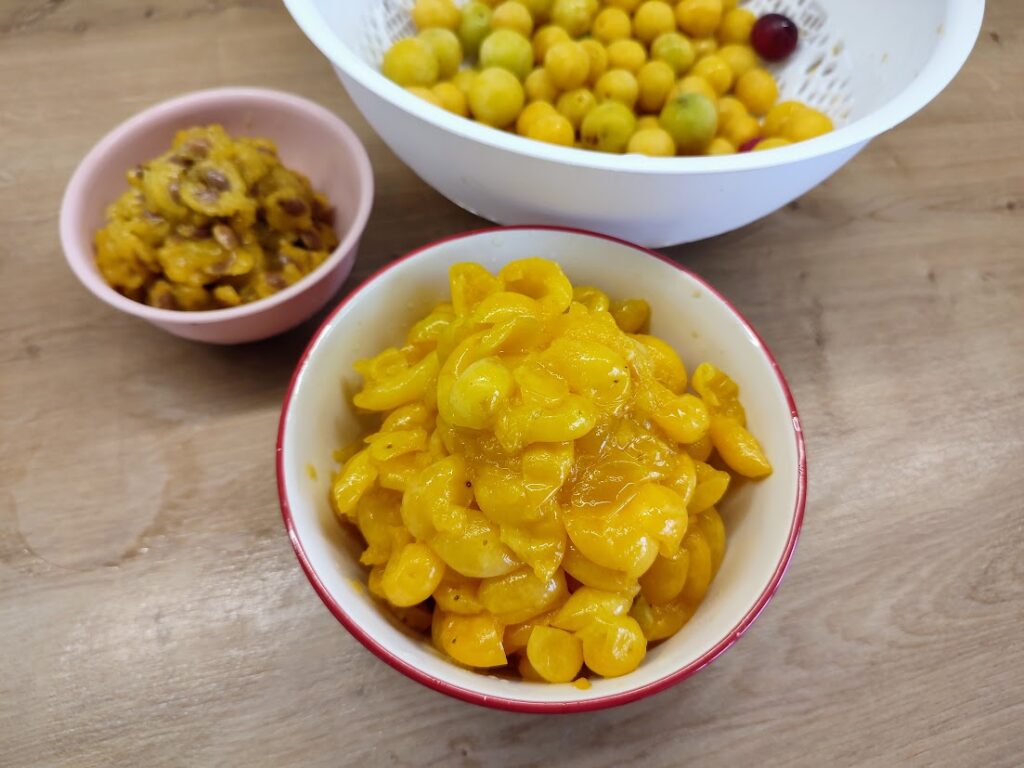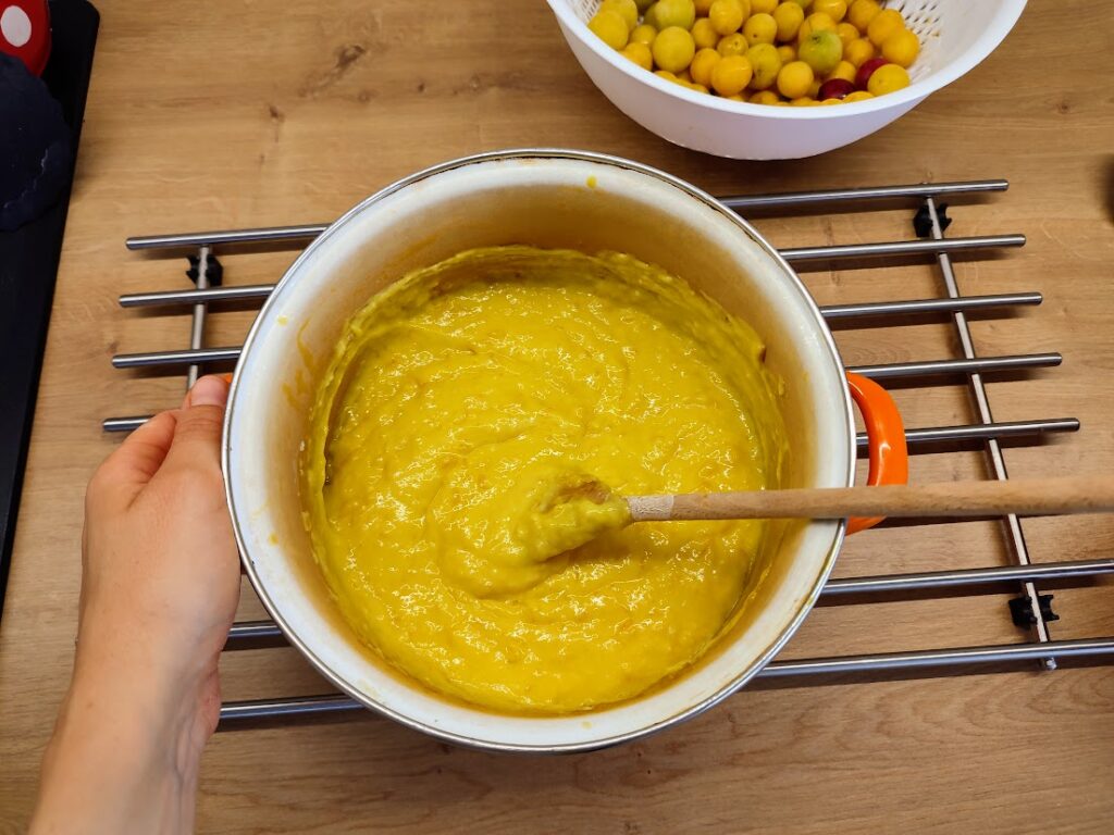 V menší misce si ve vodě rozmíchejte vanilkové pudinky. Následně je vmíchejte k mirabelkám a promíchejte. Přidejte stéviové nebo jiné sladidlo dle chuti, lžičku mleté kurkumy a také špetku soli (znásobí sladkost, nebojte se toho). Vařte do zhoustnutí cca 8 minut. Odstavte a nechte trošku vychladnout.