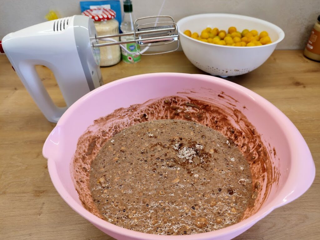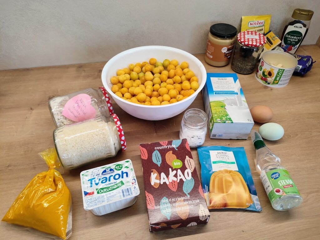 Jako plňku jsem do kakaových zdravých špaldových palačinek použila tvaroh zašlehaný do vanilkového pudinku s mirabelkovým rozvarem. Použít můžete jakékoliv ovoce, ale zrovna dozrávají mirabelky a myrobalány a špendlíky a… tak je super je zužitkovat a nenechat je přijít nazmar! Tohle drobné ovoce je kyselejšího rázu, ale v kakaových zdravých špaldových palačinkách chutná fakt výborně.