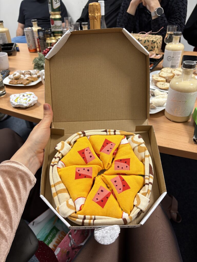 Měli jsme vánoční mejdlo s kolegy. Bylo to moooc pěkné. Miluju Secret Santu a jsem ráda, že na něho došlo. Dostala jsem od tajného Santy parádní fusekle s pizza motivem. Byly naskládané v pizza krabici a stočené do tvaru pizzy. Pro mě opravdu funny dárek. 😁