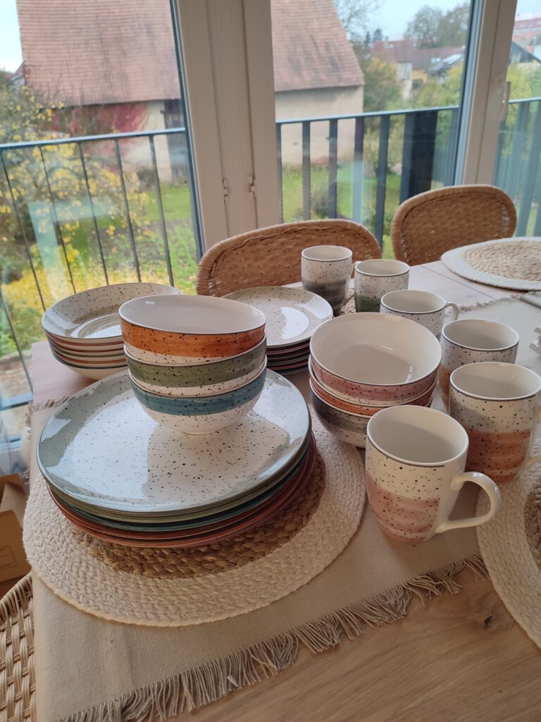 V kuchyni nám přibyl jídelní stůl a super boho proutěné židle. Vezli jsme to chudákem Fábií z Prahy a doteď nechápu, jak jsme to tam dokázali naskládat. Jo moje skills z devadesátkového hraní Tetris se občas hodí! 😅